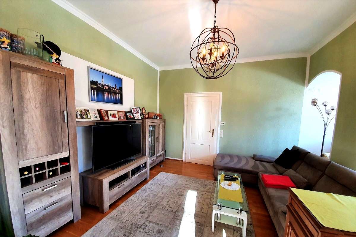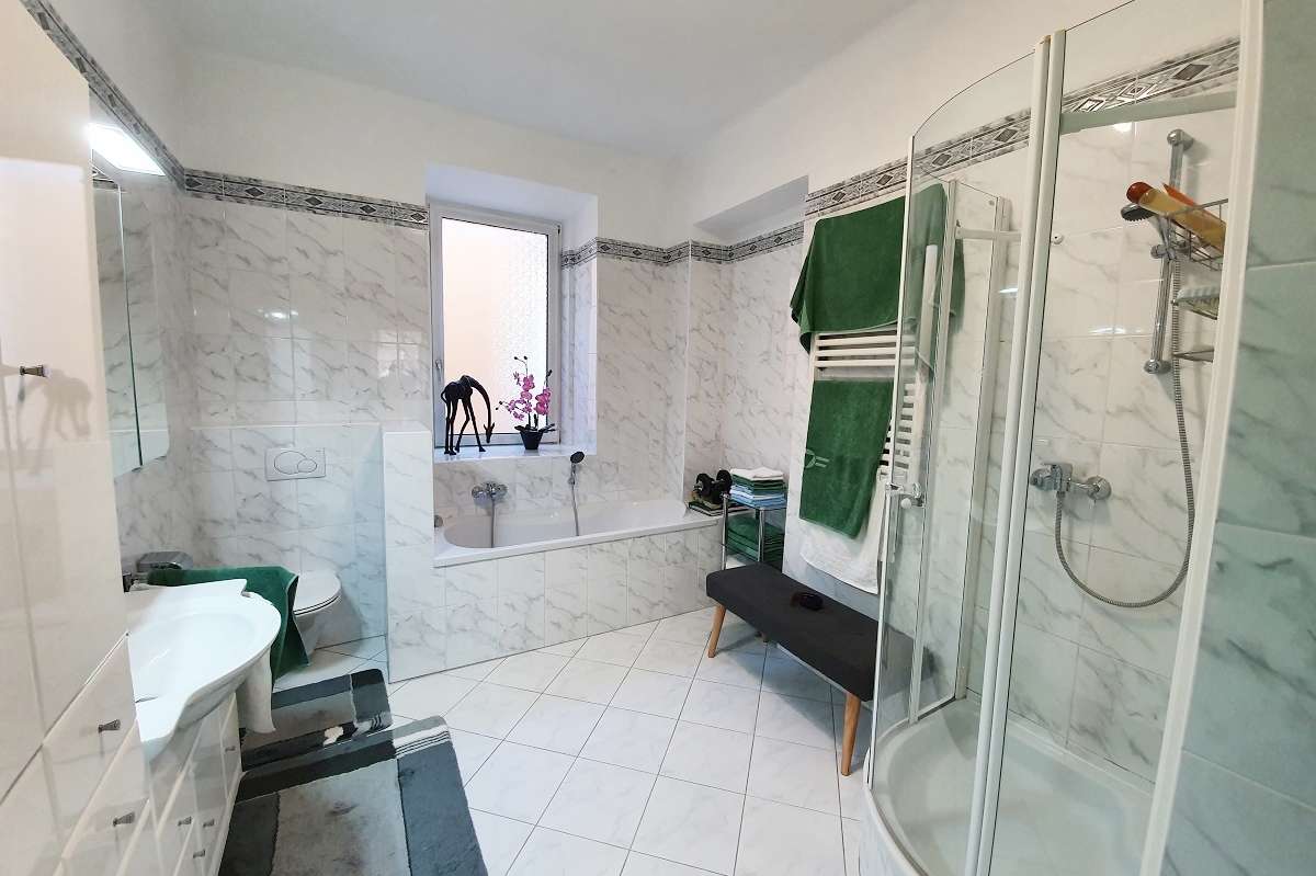 Im Erdgeschoß einer durchgehend renovierten Villa nutzen Sie Wohnzimmer, Schlafzimmer, großes Badezimmer, Küche, Speise-Erker sowie Wirtschaftsraum, Garderobe und zusätzliches WC.