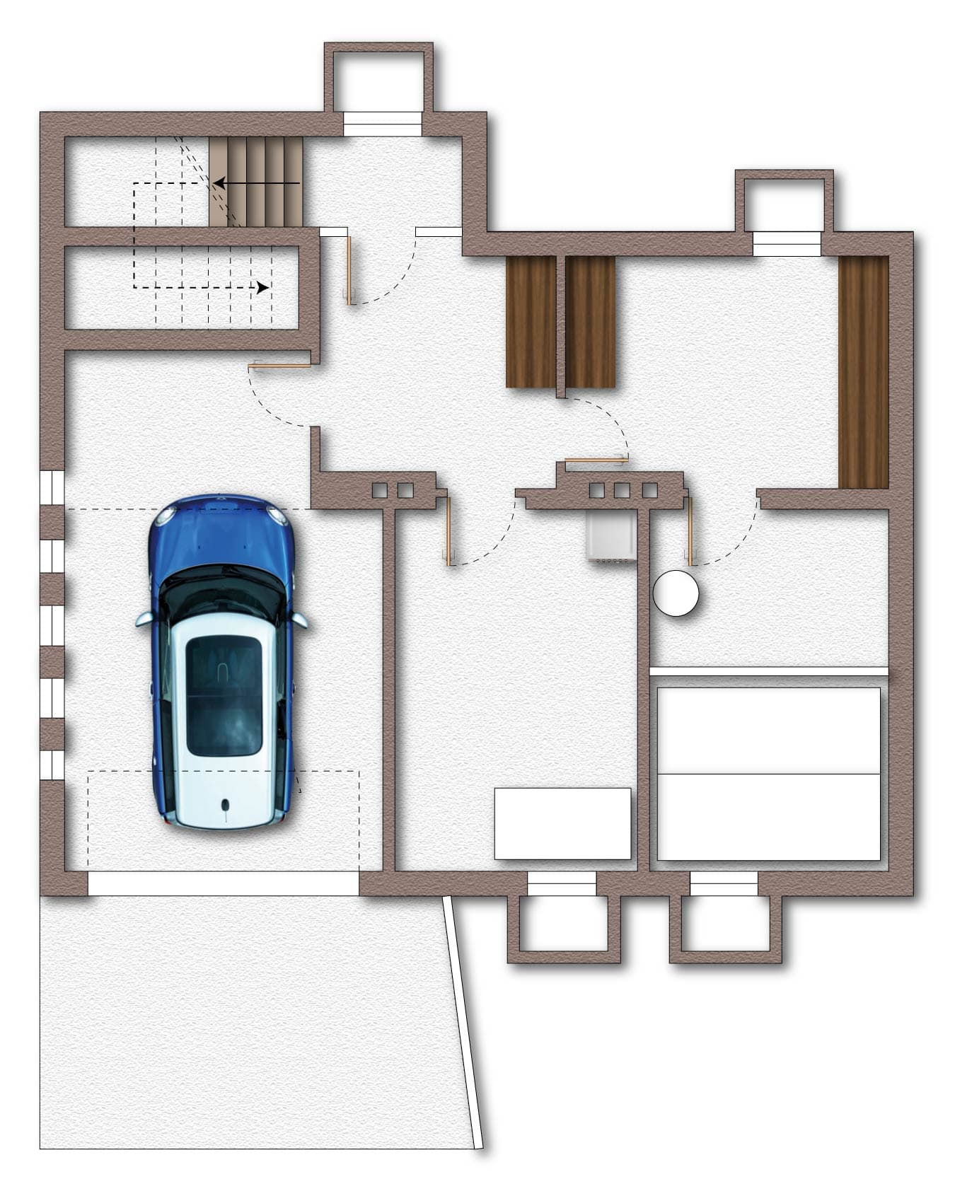 Die Liegenschaft ist vollständig unterkellert und verfügt aufgrund der Hanglage im Kellergeschoß über eine Garage. Im vorgelagerten Außenbereich stehen zudem drei weitere Abstellplätze zur Verfügung.
