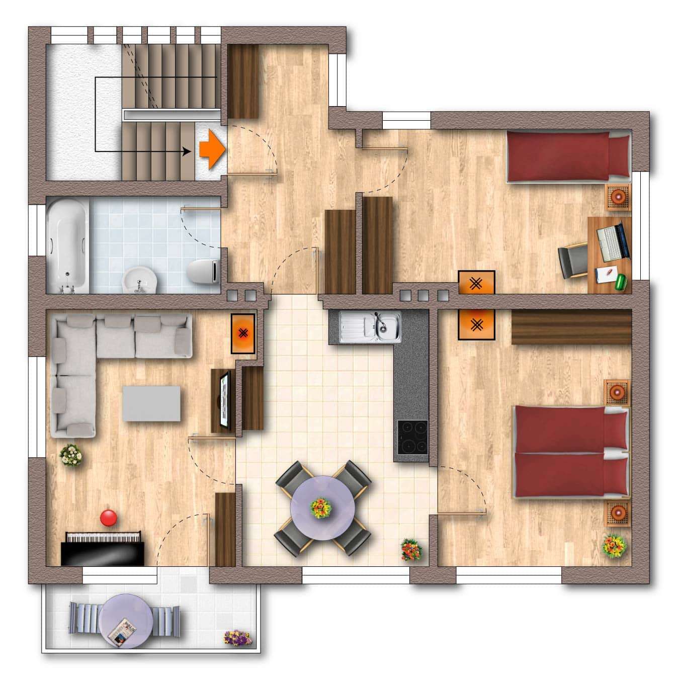 Sowohl das Erdgeschoß als auch das Obergeschoß sind als jeweils abgeschlossene Wohneinheiten ausgeführt. Jede Einheit umfasst zwei Schlafzimmer, ein Wohnzimmer, eine Küche, ein Badezimmer mit WC, einen Vorraum sowie einen Balkon.